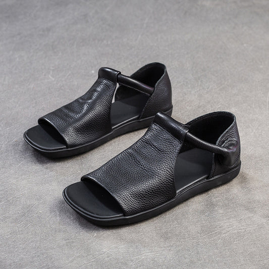 Women Peep Toe Velcro Casual Leather Flat Sandals